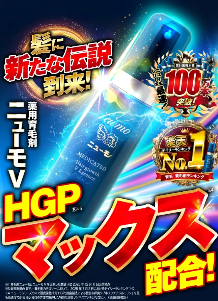 ※1 2020年度から2023年度メーカー出荷金額。育毛・発毛効果を訴求している商品を対象。日本市場において医薬品として販売されている商品は除く。(2021年9月・2023年1月・2023年9月・2024年9月TPCマーケティングリサーチ(株)調べ) ※2 2025年3月31日出荷時点。シリーズ累計は以下18商品より集計。ニューモサプリ、薬用育毛剤ニューモ(青)、薬用育毛剤ニューモ(ゴールド)、薬用育毛剤ニューモ30ml、ニューZ(第二類医薬品)、ニューモVactoryシャンプー、ニューモVactoryシャンプー(ミニ)、ニューモトリートメントM、ニューモトリートメントV 、ニューモトリートメントV(ミニ)、ニューモパウダー(黒)、ニューモパウダー(茶)、ニューモヘアミスト、マツゲ★DXウモア、マツゲ★DXメッグ マスカラ、マツゲ★DXメッグ マスカラリムーバー、マツゲ★DXメッグ マロンナ(ナチュラルブラウン)、マツゲ★DXメッグ マロンナ(グレーブラウン)、ニューモV ※3 独自の方法で製造した特別な卵黄リゾホスファチジルコリン。(頭皮保護成分)※4 HGPが従来品に比べて10倍量配合していること ※5 定期初回価格、初回限定、1世帯1回限り ※amazonの評価は2025年12月15日時点の数値