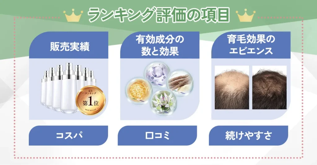 以上のポイントだけでなくコスパなども含めて総合的に判断しニコライ編集部で調査し、本当に使ってほしい育毛剤を3つに厳選しました。