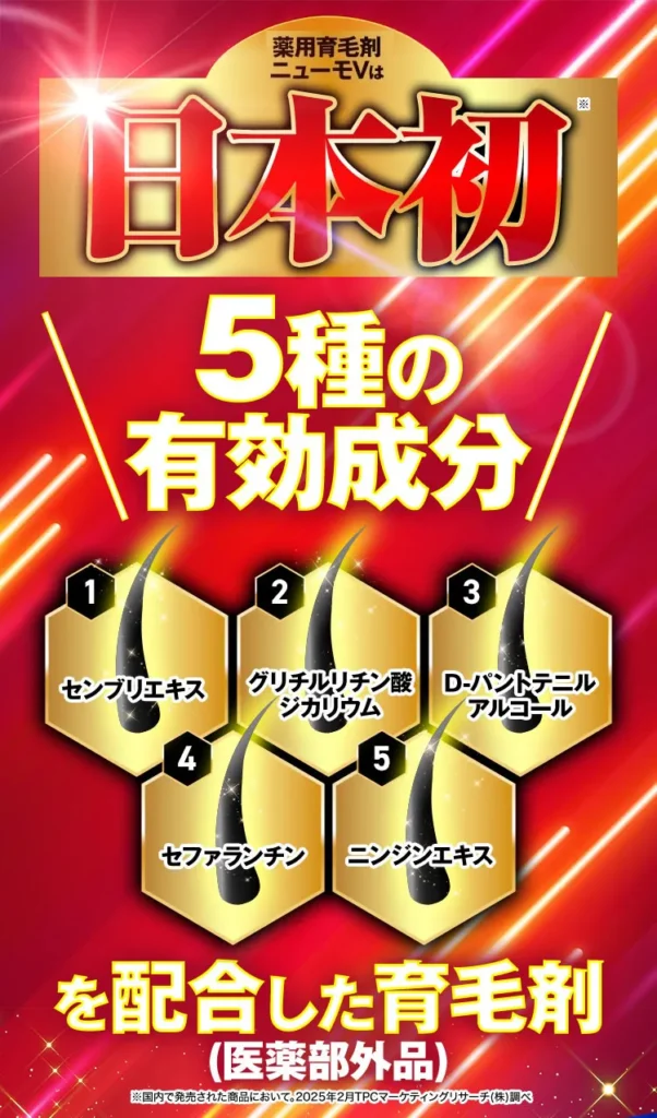 ※1 2020年度から2023年度メーカー出荷金額。育毛・発毛効果を訴求している商品を対象。日本市場において医薬品として販売されている商品は除く。(2021年9月・2023年1月・2023年9月・2024年9月TPCマーケティングリサーチ(株)調べ) ※2 2025年3月31日出荷時点。シリーズ累計は以下18商品より集計。ニューモサプリ、薬用育毛剤ニューモ(青)、薬用育毛剤ニューモ(ゴールド)、薬用育毛剤ニューモ30ml、ニューZ(第二類医薬品)、ニューモVactoryシャンプー、ニューモVactoryシャンプー(ミニ)、ニューモトリートメントM、ニューモトリートメントV 、ニューモトリートメントV(ミニ)、ニューモパウダー(黒)、ニューモパウダー(茶)、ニューモヘアミスト、マツゲ★DXウモア、マツゲ★DXメッグ マスカラ、マツゲ★DXメッグ マスカラリムーバー、マツゲ★DXメッグ マロンナ(ナチュラルブラウン)、マツゲ★DXメッグ マロンナ(グレーブラウン)、ニューモV ※3 独自の方法で製造した特別な卵黄リゾホスファチジルコリン。(頭皮保護成分)※4 定期初回価格、初回限定、1世帯1回限り ※5 保湿成分の総称 ※amazonの評価は2025年12月15日時点の数値