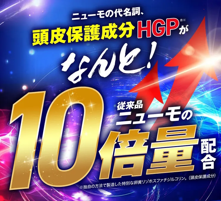 ※1 独自の方法で製造した特別な卵黄リゾホスファチジルコリン。(頭皮保護成分) ※2HGPが従来品に比べて10倍量配合していること