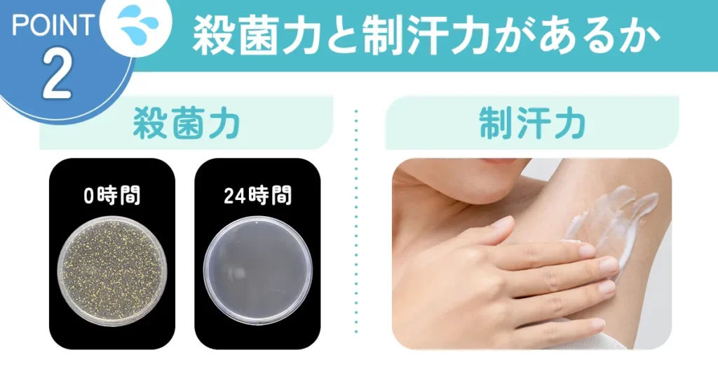 ニオイの原因となるワキガ菌を撃退する「殺菌力」があり、そもそものニオイの元となる汗を防ぐ「制汗力」があるかは要チェック!